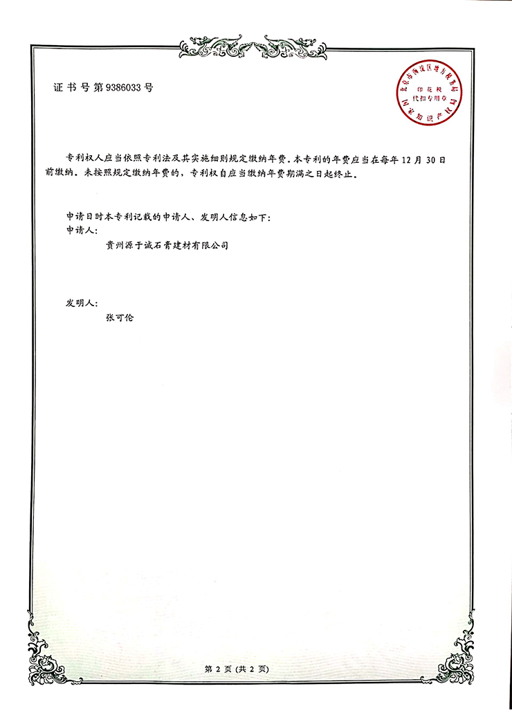 專利證書(一種石膏板側(cè)壁紙面粘結(jié)裝置)